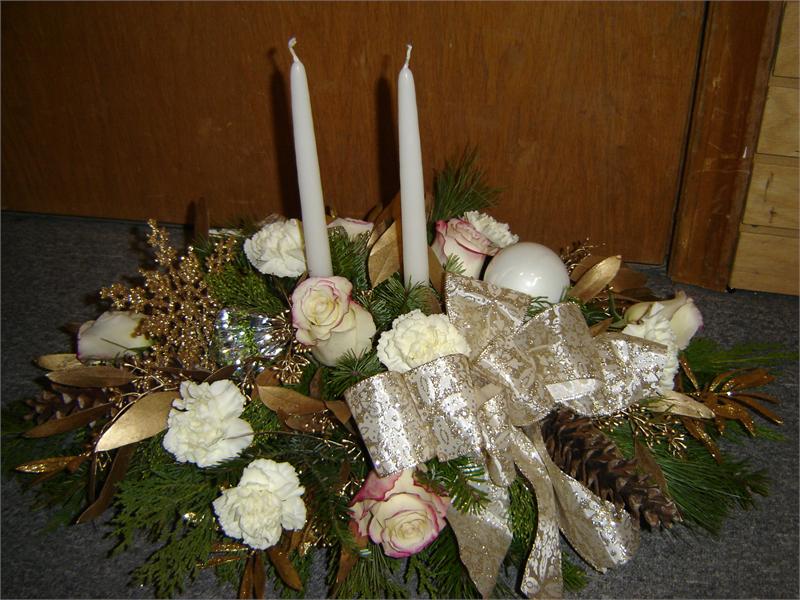 A beautiful white and gold centerpiece for the holidays, with candles. We can customize this arrangement for you just call us at 574-935-9400.